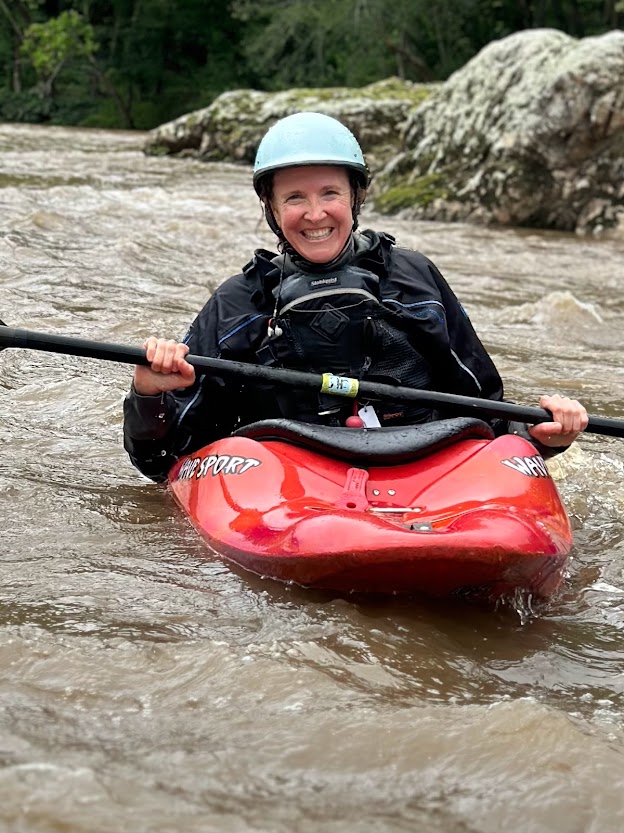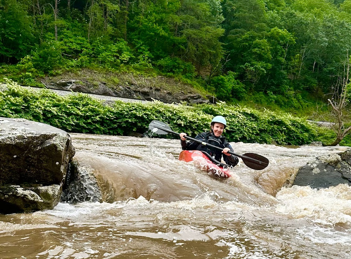 We made plans to meet at the river, and I would keep her posted on the level. The rains came and the waters rose and on Thursday, the French Broad was running a burly 5600 cubic feet per second (cfs). Normal summer flows when we take campers are 3,000 to 1,200. This would be bigger water, bigger than the Pigeon River that campers run, as big as the Ocoee (class 3+/4- rapids) - which is the top grade of difficulty that we run with campers. This is my home river, and I’ve paddled it hundreds of times. I know the levels and the lines through the rapids and knew that this was a reasonable proposition since I could give her 1:1 safety coverage.